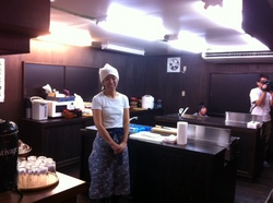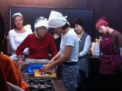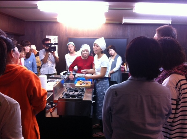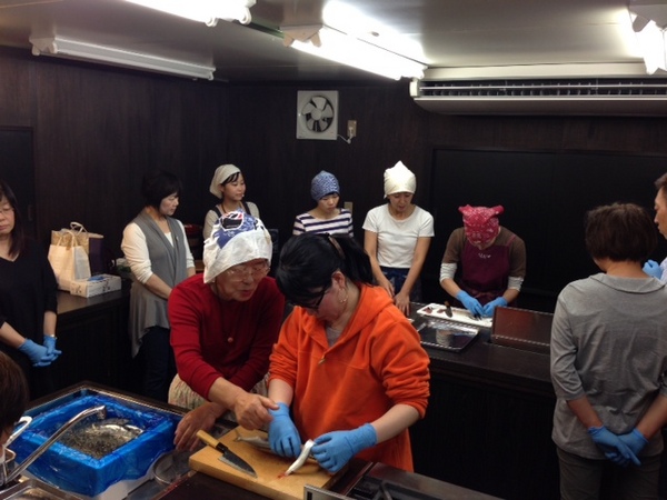 和枝さんが 「簡単すぎるサンマのおろし方」をレクチャー中です。 これから皆でひとり一匹サンマを おろしていきますよ。
