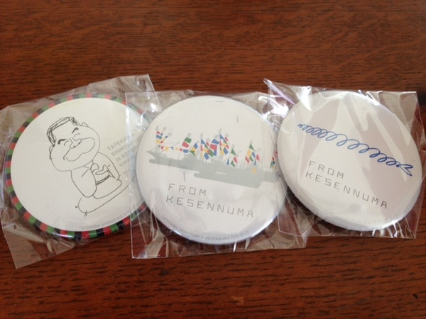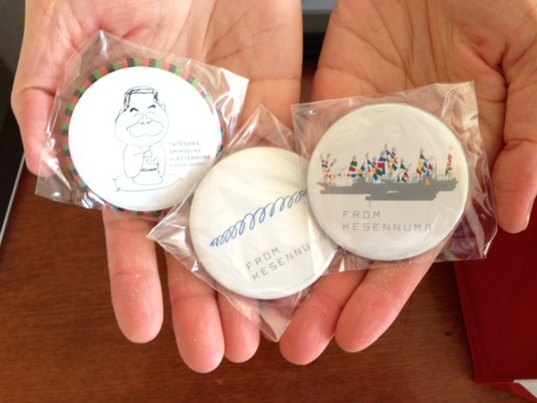 気仙沼さんま寄席バッジセット。 なんと、3個で500円という安さ! 「50セットは売りたい!」と 担当者は申しております。 お土産として喜ばれそうですね。 |