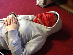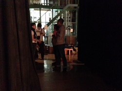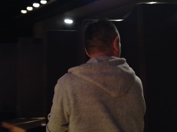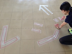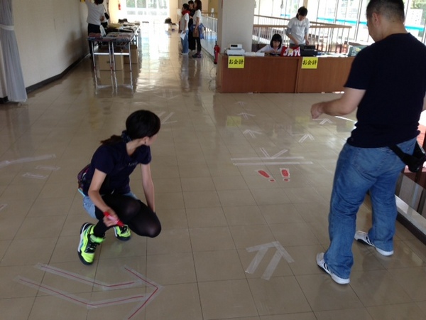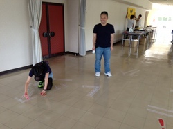 シブヤとイサワが、 なにやら床にテープを貼ったり、 その上に書いたり・・・。