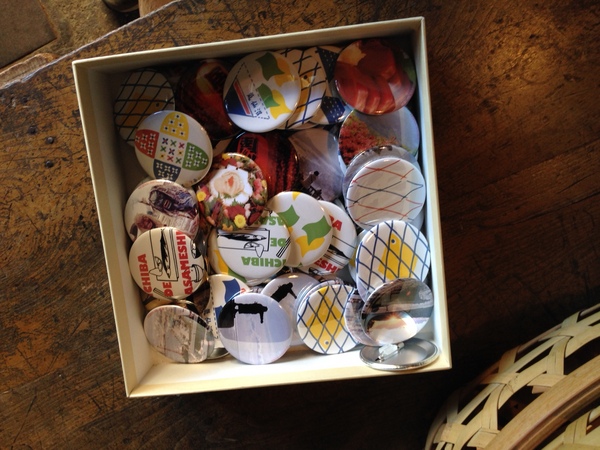 一瞬おじゃましたら あすの「市場で朝めし。」で販売するバッヂなどが スタンバイされていましたー。