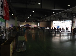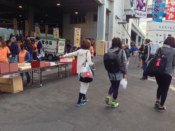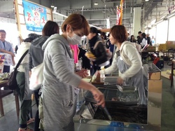 こちら、魚市場の 「市場で朝めし」会場です。 平野レミさんの海カツサンド部隊、 あと15分の開店を前に 超特急準備中です。
