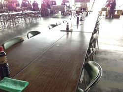 港のそばで、長ーいテーブルで、 みんなで並んで、食べられます。 晴れてて気持ちいいですよ! |
