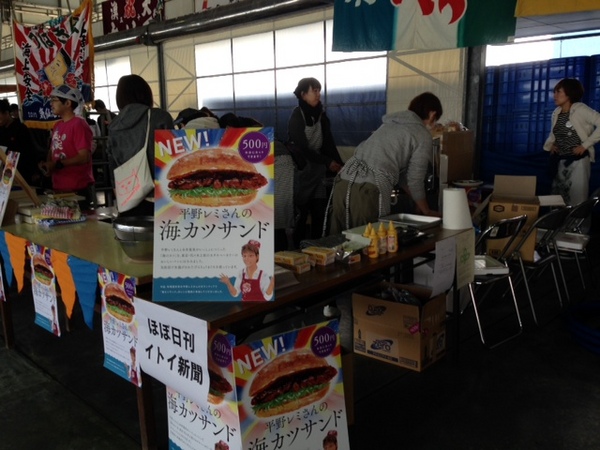 海カツサンドのブースは、 魚市場の奥のほうにありますよ。 1個500円で、パンがなくなるまで、 やってます。 ぜひ見つけて、食べてくださいね。