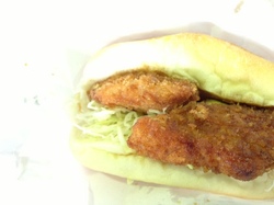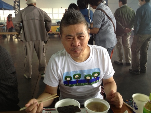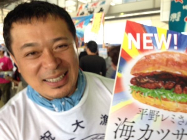これも、いきます。 揚げたて! う、うまい! 写真のすごい男性は このカツのマグロを ぼくらに出会わせてくれた、 磯屋水産の、 りゅーーじさーーん! |