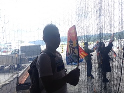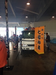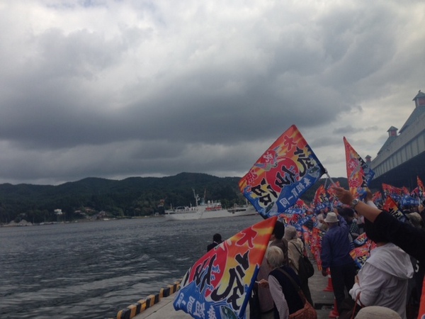 まぐろ漁船が、これから 漁に出ます。 その船出をみんなで、見送ります。 椿会から旗が貸し出されまして。