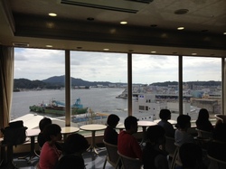 まずは3月11日になにが起きたか、 という15分ほどのビデオ上映。 窓の向こうにはのどかな気仙沼の港。 そこが、あの日、どうだったのか、 というビデオです。