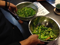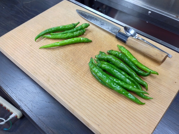 青唐辛子は、まずヘタをとり タテに割って スプーンの先で種をとったものを 左のボールのような状態に。