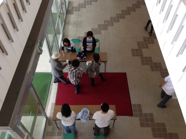 たくさんの方が いらっしゃってます。 ぼくはこの、気仙沼市民会館の、 二階の吹き抜けのところから 下を見おろすのが好きなんですよね。 この微妙な距離感。 |