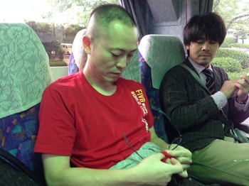 本日の別府。雨で寒いです。長袖に上着が必須。お隣のおっくんの服装が正解。なのにこの男は半袖。