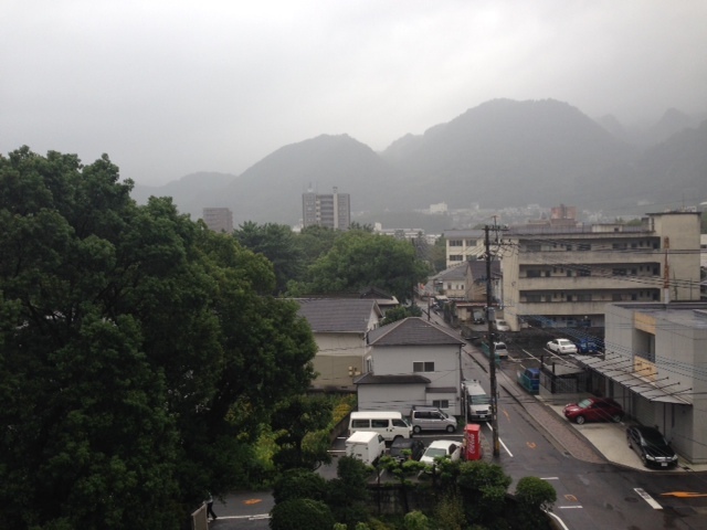 別府2日目。朝です。雨だー。そして、山の上は霧。でも寒くないです。