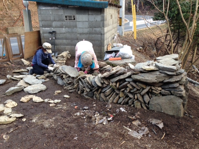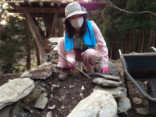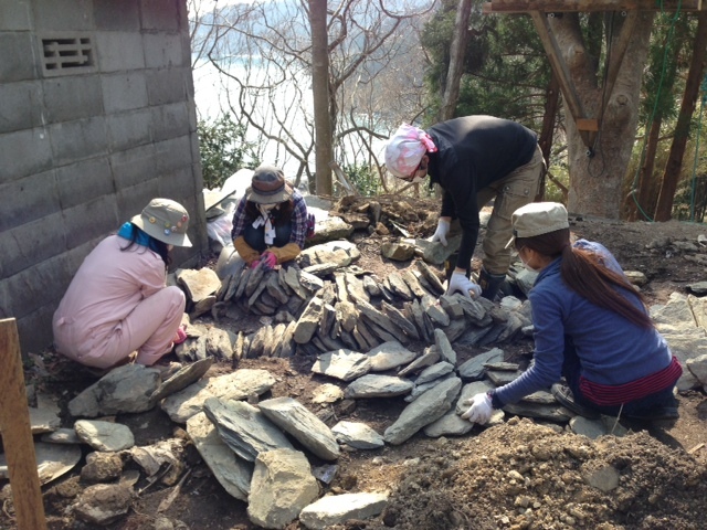 集めていた石を積んでいます。
