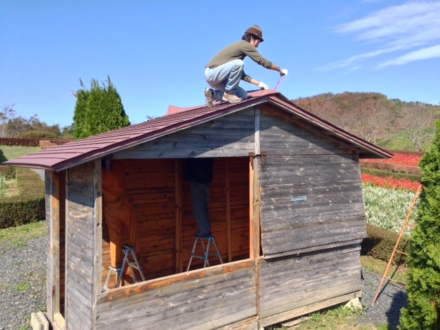 おはようございます!今日はアーク牧場さんへお邪魔しています。ツリーハウスづくりに廃材を集めているといったら、「壊す予定の小屋があるから、 どうぞ使ってください!」といってもらえたので、解体してから運びます。(みちあり)
