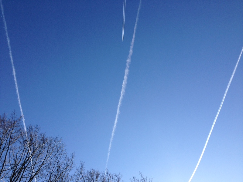 上を見たら、ひこうきぐもが、