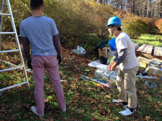 本日の作業、終了です。さすがに山。16時過ぎると一気に暗く、そして寒く。今日やったことは‥‥木材をはこんで、基本となる板をとりつけて、そこを基本に土台をつくりました。けんちゃん的には、「これでデッキはできたも同然す」マジすか!明日が楽しみです。お疲れさまでしたー!(ぐっさん)