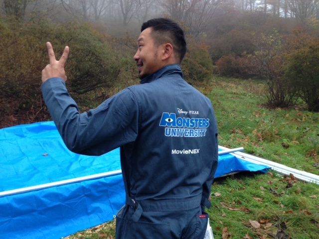 さあ、2日目。えー、本日天気が荒れるそうです。現場は、風若干強め。雲の中にいる感じです。安全第一で今日もがんばりまーす。そして昨日、ナイスなツナギが届きました。ツリーハウスは、東北ツリーハウス観光協会が作っているんですが、「お、そんな楽しいことするなら!」と、『モンスターズ・インク』MovieNEXが協力してくれてるんです。今日もはりきってまいりまーす。(ぐっさん)