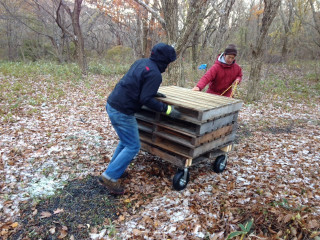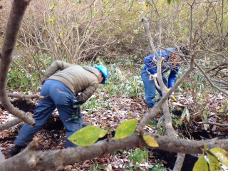 さ、さむい‥‥今日の気仙沼、特別寒いです。山の上はなおさらです。手がかじかんで携帯の文字がなかなか打てません。もうちょっと、暖をとる対策をとらないとだなぁ‥‥。今日はツリーハウスの0号と1号の二組の制作チームが作業をしてます。寒いけど、作業は進んでるみたいです。(サユミ)