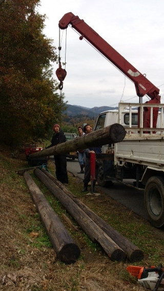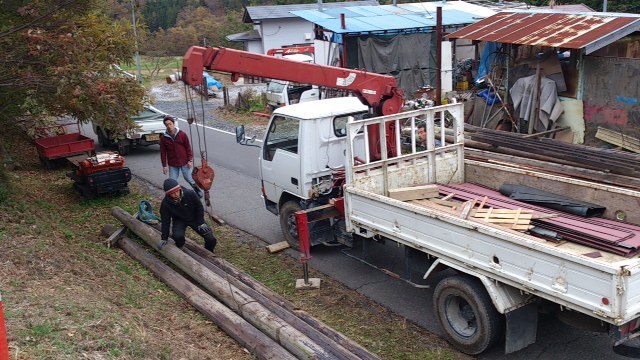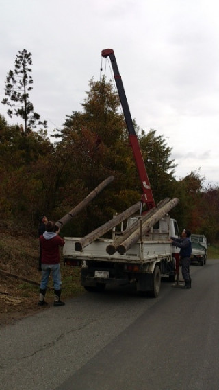 本日の作業もうひとつ。ツリーハウス0号チームは、7mの木製電柱を、一ノ関から搬入しました。ツリーハウスのアドバイスをくれる、大工のたっつぁんに、協力してもらいながら、資材を手に入れることができました。搬入も手伝ってくれて、ほんと助かります。寒さが厳しくなってきましたが、本日から木登り先輩ことツリーヘッズの竹内さんも加わったので、0号チームもはりきって進めて行きたいです。(みちあり)