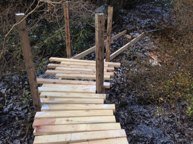 昨日の午後からデッキを作っています。ここからツリーハウスに入るようになる予定です。森からツリーハウスへの入り口は、ぱっと見、どこにあるかわからないんです。もともとの予定だった場所から、こっちの方が面白い!というとこで、場所を変更。デッキも延長して、とてもなだらかなスロープにしました。早く上を歩きたい!(ぐっさん)