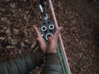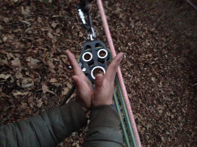 作業終わりに0号の現場をのぞいてみました。みちありくんが出張でいなくて、木登り先輩たちが作業を進めてました。そこにあったロープ用の滑車がこれです。「なーー!」という感じだなぁ。とおもっていたら、けんちゃんが手を添えて、「ムンクの叫び」に。今日もお疲れ様でしたー!(ぐっさん)