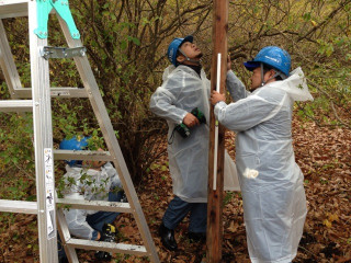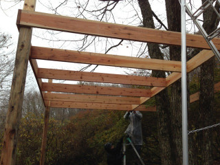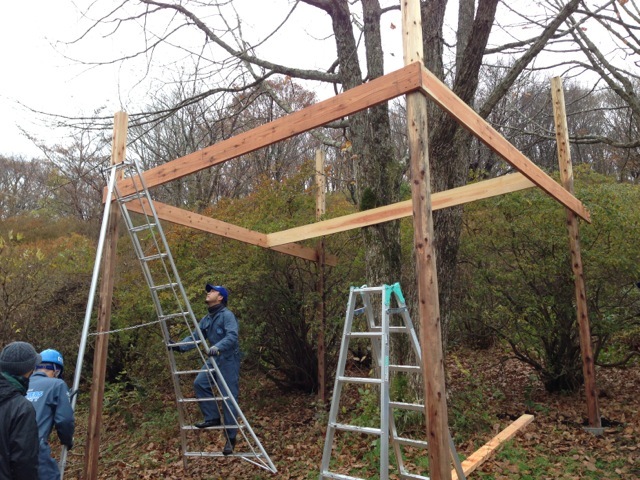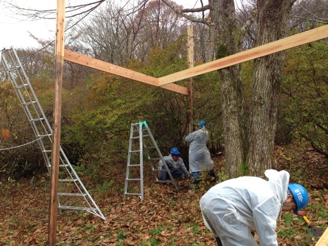 1号の基礎となるデッキ部分を作っています。0号は木の上に乗っかる形でできるアドベンチャータイプの本格的なツリーハウスなのですが、1号は木を取り囲むデッキタイプのツリーハウスにする予定です。特徴としては、面積が大きくて、たくさんの人が入れることと、土地の傾斜を活かして作るスロープのアプローチであるということ。小さいこどもから、お年寄りの方まで、気軽に来られるツリーハウスをめざす予定です。まずは、基礎を埋めて、柱を立ててデッキを作ります。(ぐっさん)