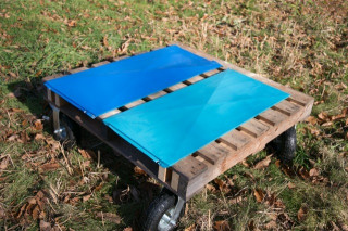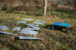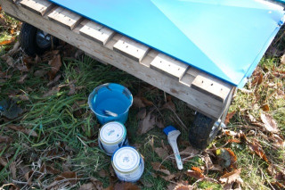1号の部材に使う、トタンの色を作ります。1号は爽快な青メイン。そして、ちょっと緑よりの2色を使いますよ。ペンキは乾くと色が変わるからちょっと乾かしながら。3枚目の画像は、散らかしているわけではなくて、トタン材についてる霜を乾かしているのです。(ぐっさん)