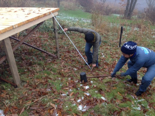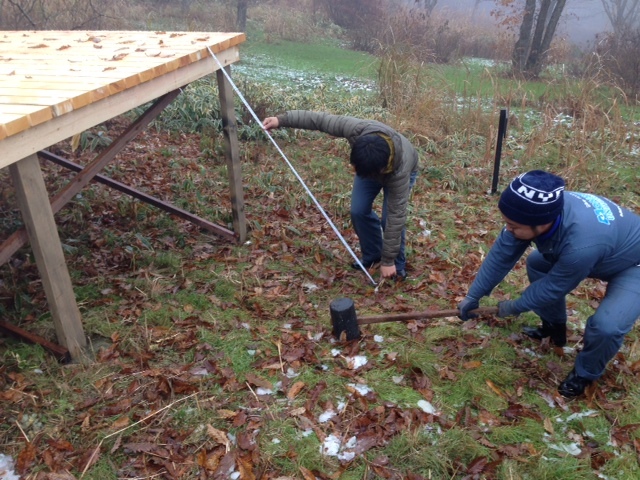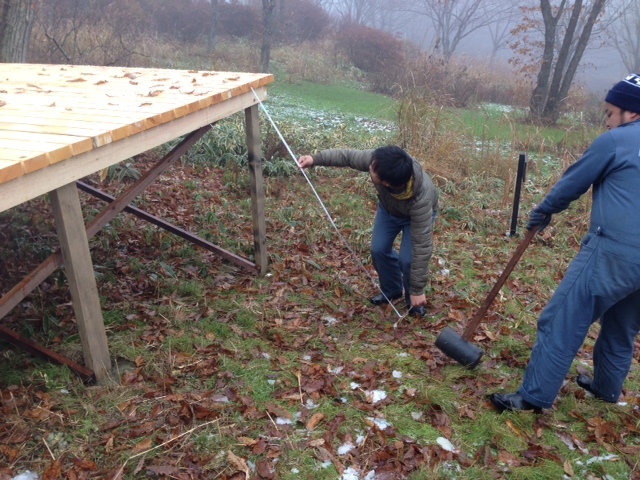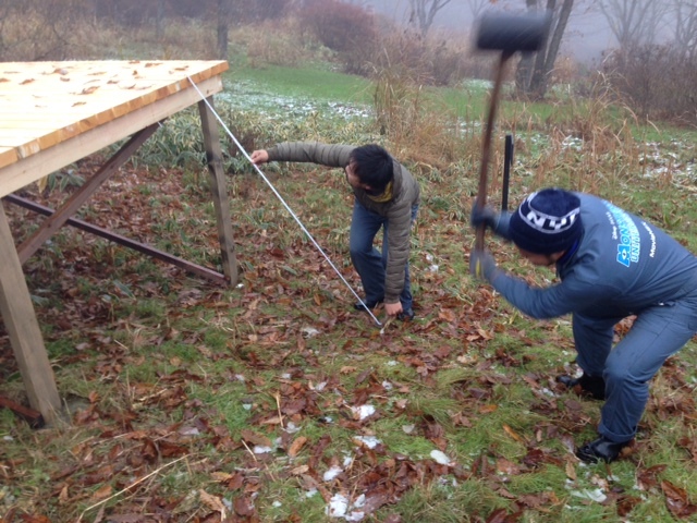 さ、紅茶を飲んで作業開始。昨日できたウッドデッキに階段を作ります。プチ清水寺の舞台になる予定なんでね。あった方がいいよね。ドス〜ん!ドス〜ん!こうやってふかふかの地面を固めてからつくりますよ。(ぐっさん)