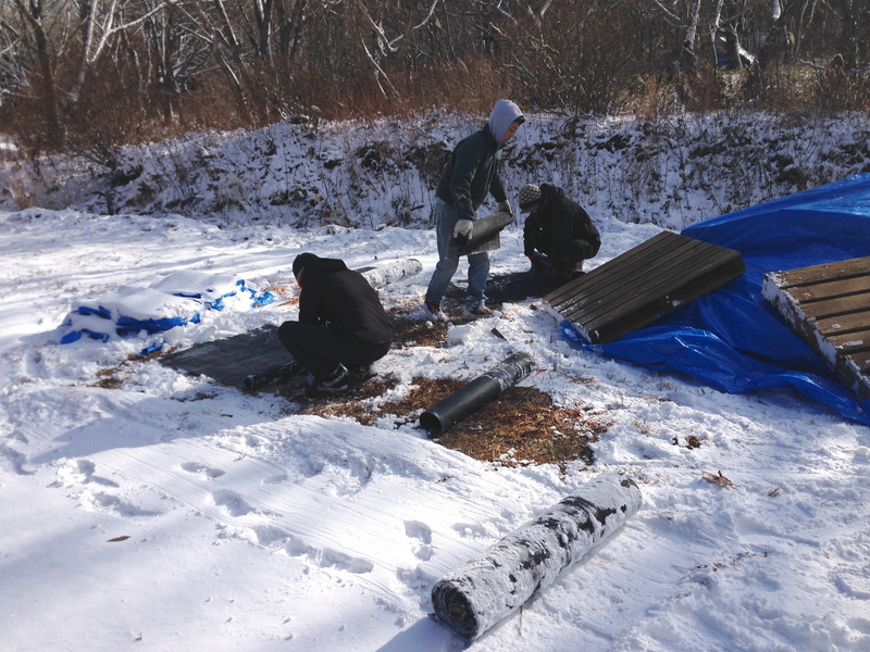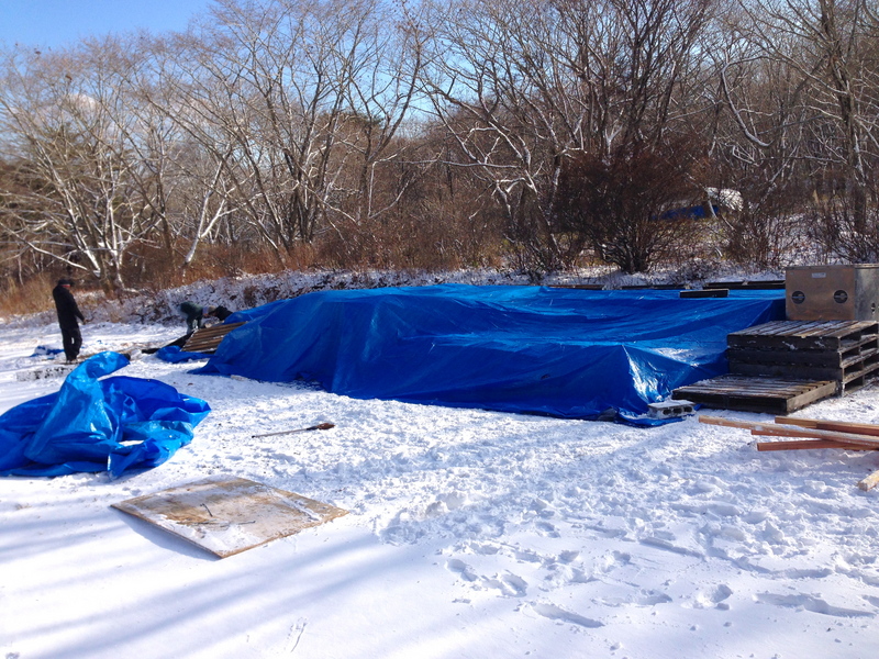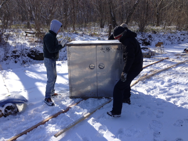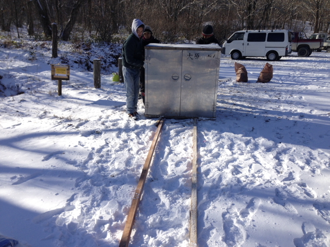 ほぼ日メンバーが資材の片付けを手伝ってくれたんですが、まだ半分ほど残っていました。次に雪が降るまえに、と、さっそく資材の冬支度を再開します。道具箱(給食用の食器入れ)もレールをつくれば雪のおかげでスイスイすべって運べます。「むかしの人もこうやってたんじゃない?」「むかしの人は給食の箱なんて運ばねぇぞ。」相変わらずのかんじで、どんどん整理整頓していきます。(みちあり)