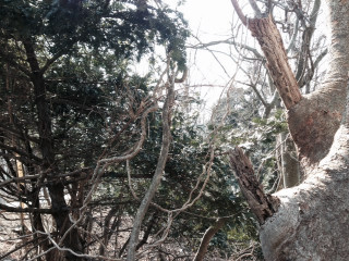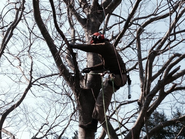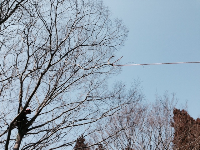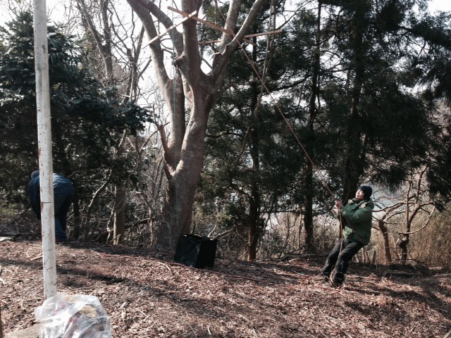 ツタがすごい絡まっていて木にも作業にも良くないので、初木登りのダルくんがツタを切っていきます。竹内さんも、長いツタをロープでひっぱりますが‥‥「いやぁ、絡まりすごくてとれないねぇ。」ツタとの格闘第1ラウンドでした。(みちあり)
