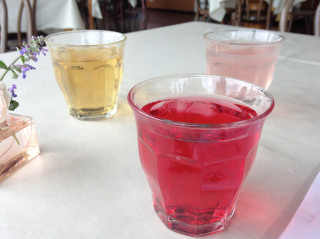 アーク牧場さんにて。夏に行う予定のイベントの打ち合わせの時に、きれいな飲み物をいただきました。赤がローズヒップピンクがしそジュース黄色がカモミールです。アーク牧場さんには、ハーブ園があり、おみやげ用ハーブティーもたくさんとりそろえています。(サユミ)