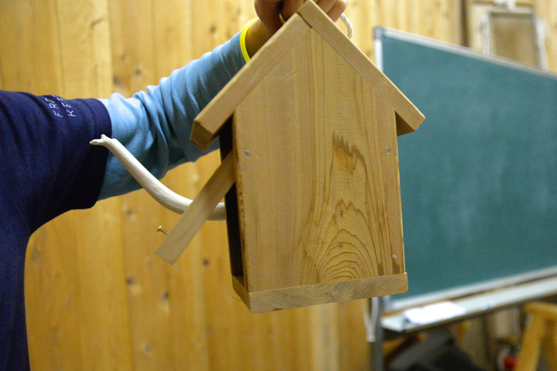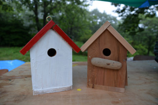 右が石巻工房の千葉先生の作品、左が私スガノの作品です。屋根が大きくあいているのがわかりますでしょうか。たてつけもよくありません。でも、子どもたちに「スヌーピーの小屋みたいで かわいいじゃん」となぐさめてもらいました。今回のバードハウスは冬におそうじができるようにドアが開くタイプになっています。