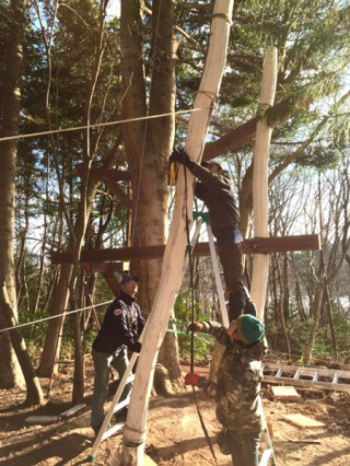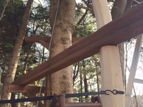 柱をロープで固定して、根太をのせるビームを柱と組んでいきます。 人手がいるのではまわらすをサポートする白鳥さんも駆けつけて、ホンマさん、まこっちゃんと4人で材料を吊上げたり、加工したりしながら組み上げていきました。 角材と自然の木の形をきれいに組むのって以外と難しいんですけど、今日はバシッと決まる日ですねぇ。 (みちあり)