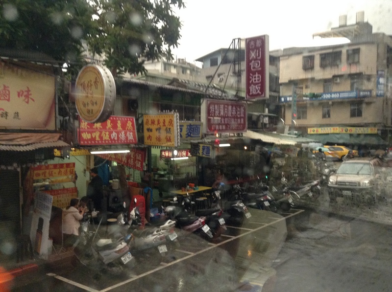バスに乗って市街に向かいます。 雨が降っている。 すでに景色がおいしそう‥‥ グーーーー。 |