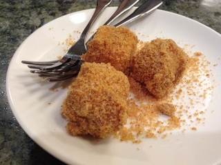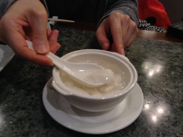 ジャンボが 杏仁豆腐を食べる。