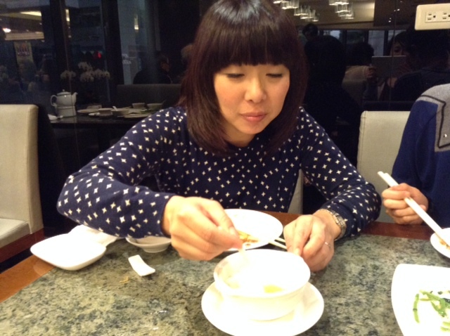 「シブヤちゃん、食べて食べて」 とせがまれ、 ついにシブヤが杏仁豆腐に着手。
