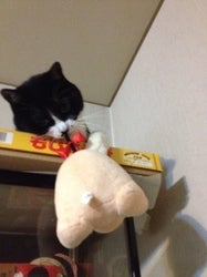 ぶれちゃったんですがどせいさんと遊ぶ(?)うちのめーたです。くわえてます。
