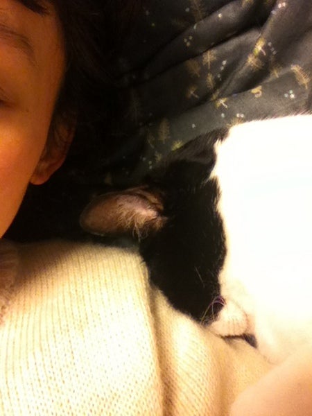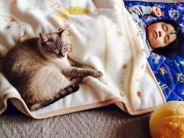 猫の日、おめでとうございます??我が家の7匹の猫たちは、息子がお昼寝すると、我先にと添い寝しにやって来ます。添い寝争いの勝者マリモと息子です。