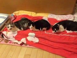 左からビチオ君、チビ君、コゲ君です。我が家は多頭飼いで、現在8ニャンいます( ´ ▽ ` )ノ血の繋がりがなくとも家族なんだよね?君たちのおかげで毎日幸せだニャン?