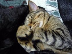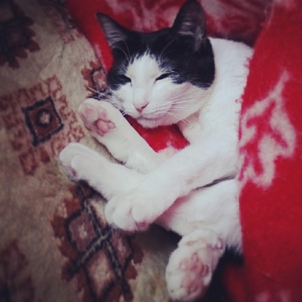 ハッピー!猫の日!!ひざ掛けをそっとめくったらこんな顔。にゃーわせなひとときです。