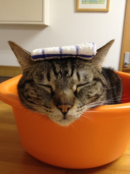 いい湯だにゃ〜(=^ェ^=)※洗面器にお湯は入っていませんきたがわみやこ( ´ ▽ ` )ノ
