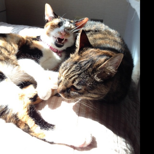日向ぼっこ中のうちのネコ、くー(キジ)&梅子(三毛)。この光景をずっとずっと守りたいと思いました。