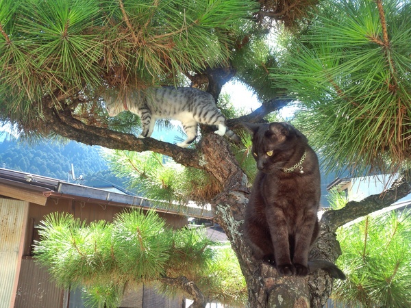 我が家の兄妹猫。二階のベランダから、庭の松の木に登っちゃいます。お願いだから落ちないでね。
