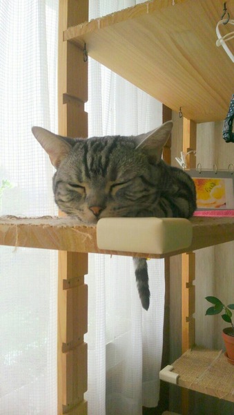 ウチの愛猫 「マッチ」3歳です。ダンナ手作りのキャットタワー。ここでのお昼寝が一番好きみたい。元気で長生きしてね。