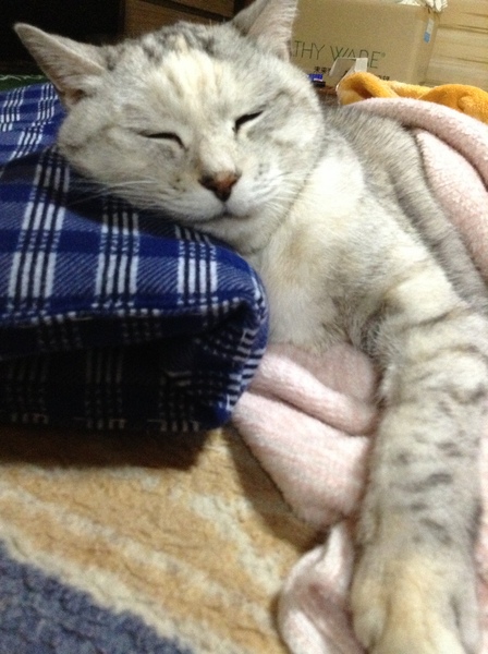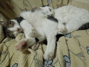 兄弟、手足入り乱れて昼寝中です。猫の日、ばんにゃ〜い