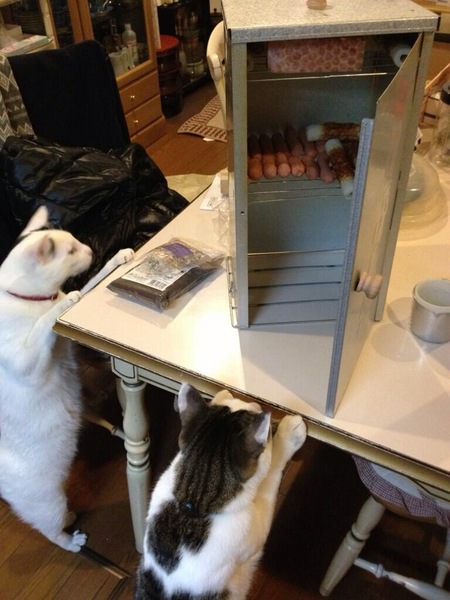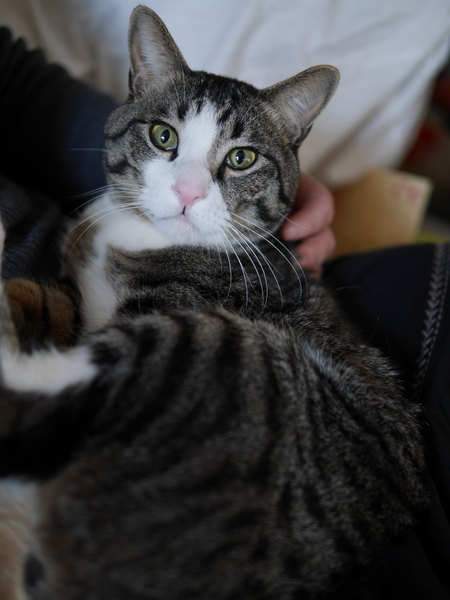 真顔で攻撃するサッチ、にっこり受けるニッチ、ゲームに熱中するオット、カメラで狙うワタシ、各自ひまつぶし中。ねこの日おめでとう