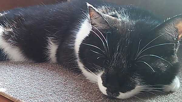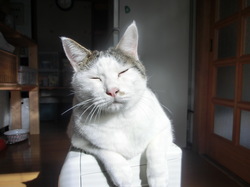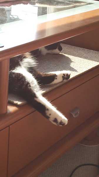 この机の下が一番寝心地いいにゃ!朝のおひさまがぽかぽか、やめられませんにゃ〜