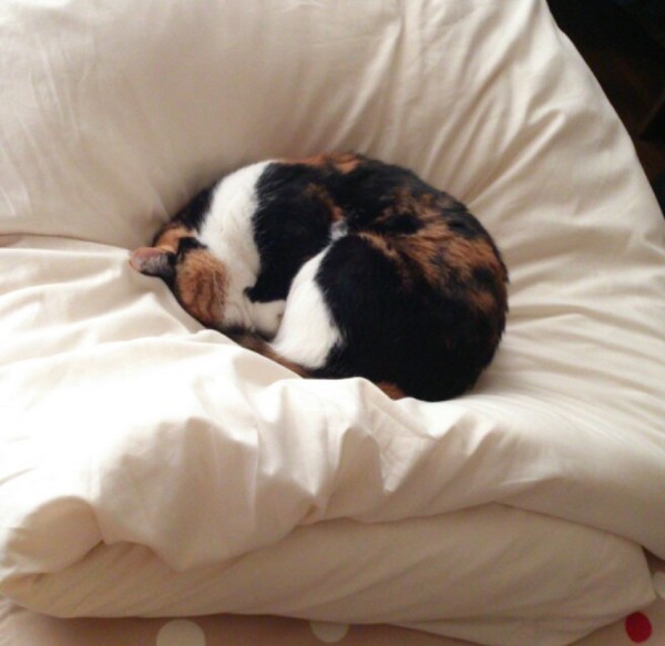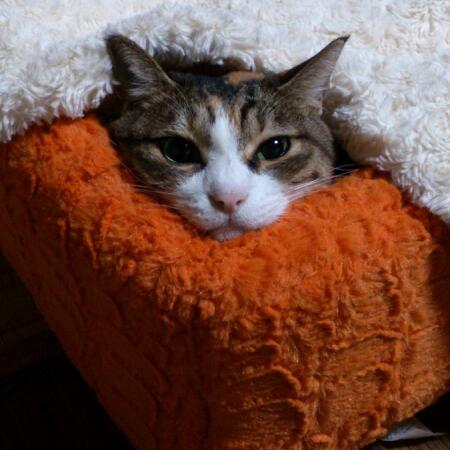 我が家の猫、ふうこです!寒くて布団の上で丸くなって寝てます(笑)ねーこはふっとんーでまっるくっなるぅ〜
