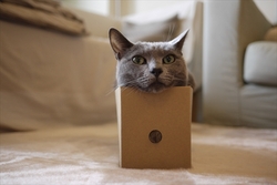 うちのグン太も、世界中のネコと同じように箱が大好き。どんなに小さな箱にでも入ってみせます!