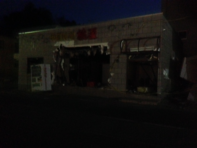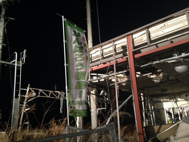 富岡の駅で、「がんばろう福島」の旗が強い風になびいていました。