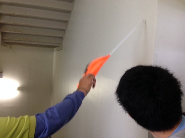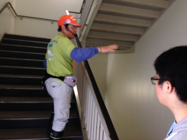 魚市場の屋上にのぼる途中で案内の方がふと足を止め。「震災のときは、 ここまで水が来ました。 このあたりにうっすら 水のあとが残ってます。 見えるかな」ここは2階から屋上へのぼる階段です。こんなところまで、水が。