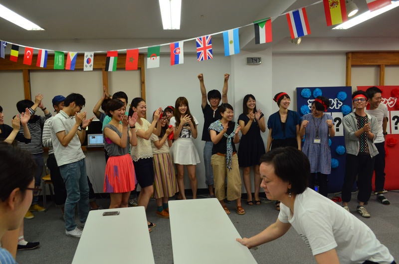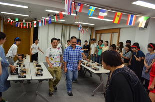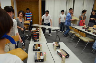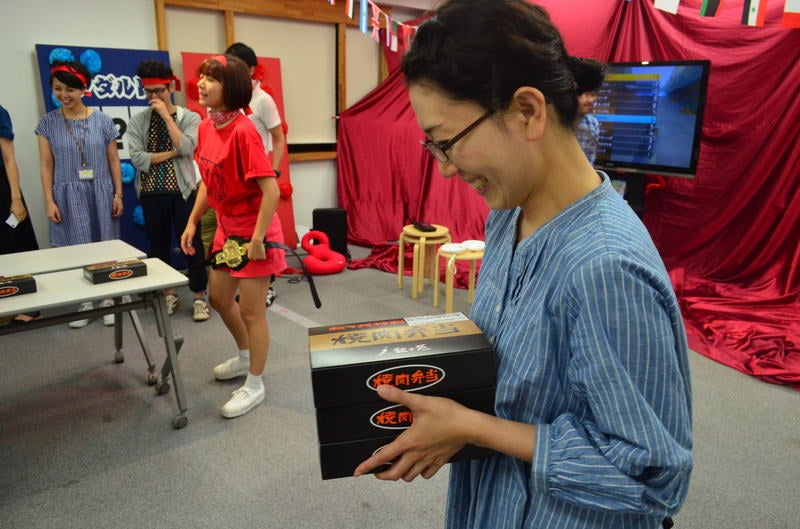 さあ、約束どおり、負けたチームが焼肉弁当を準備します。机を並べ、イスをもってきて、ざぶとんをのせて、焼肉弁当とお茶を並べます。ご覧ください。アラフォーはもちろん、アラフィフのみなさんも、若者のために焼肉弁当を配膳しています。勝負は勝負。こういうことは、いさぎよくやらないとね。
